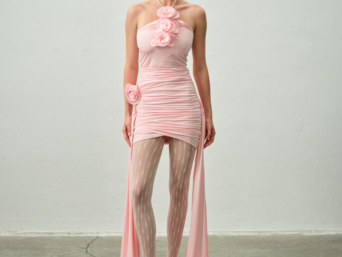 2 rose-detailed skirts at the hips, draped mini skirt with a long tie down the legs on both sides and top