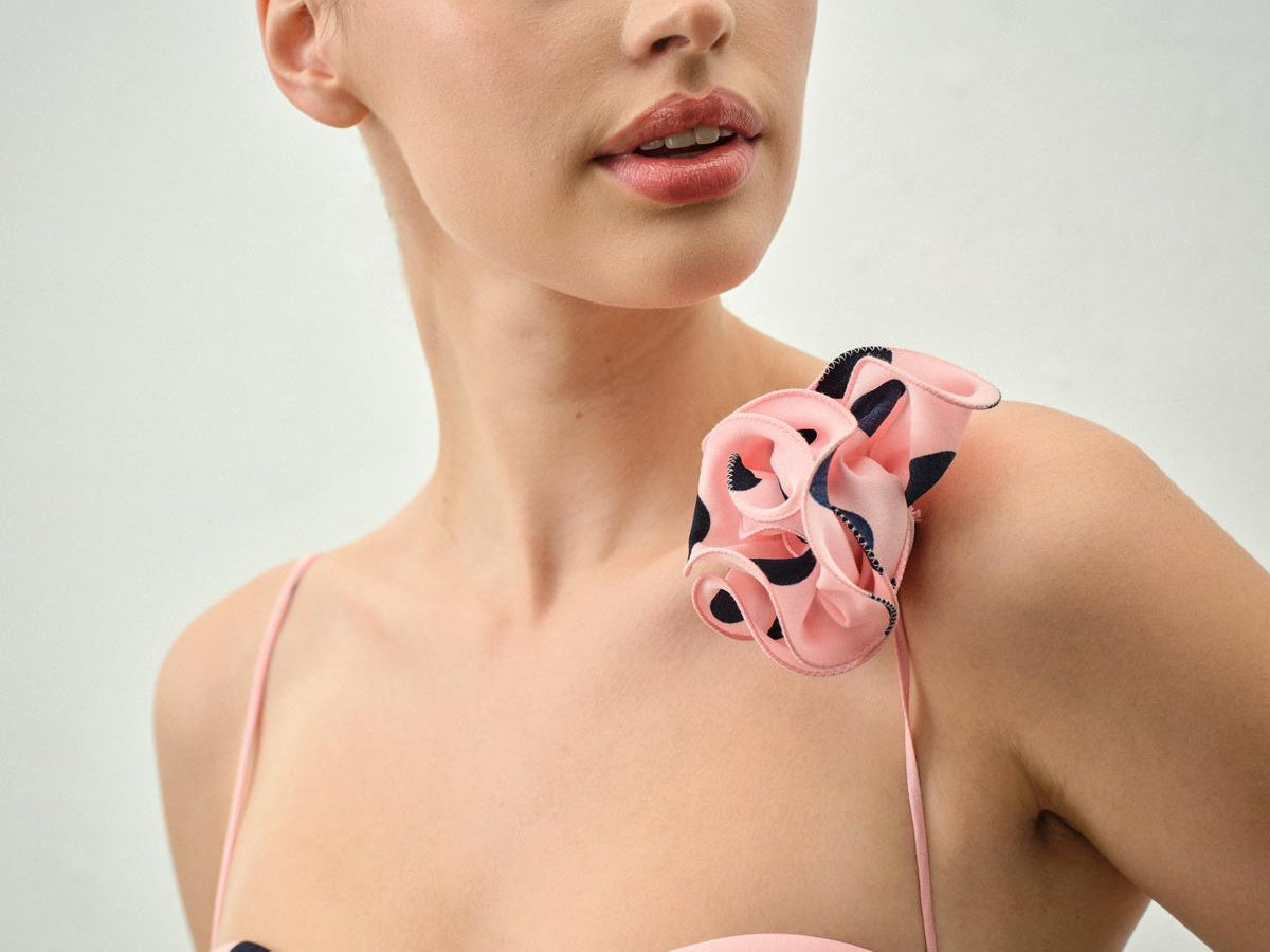 A polka dot tank top with delicate spaghetti straps and a sweetheart bustier neckline, finished with a removable floral appliqué for a distinctive, feminine touch.