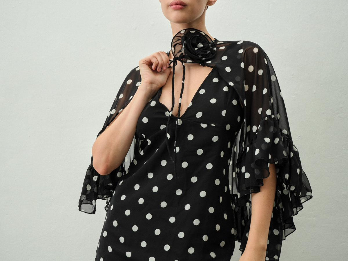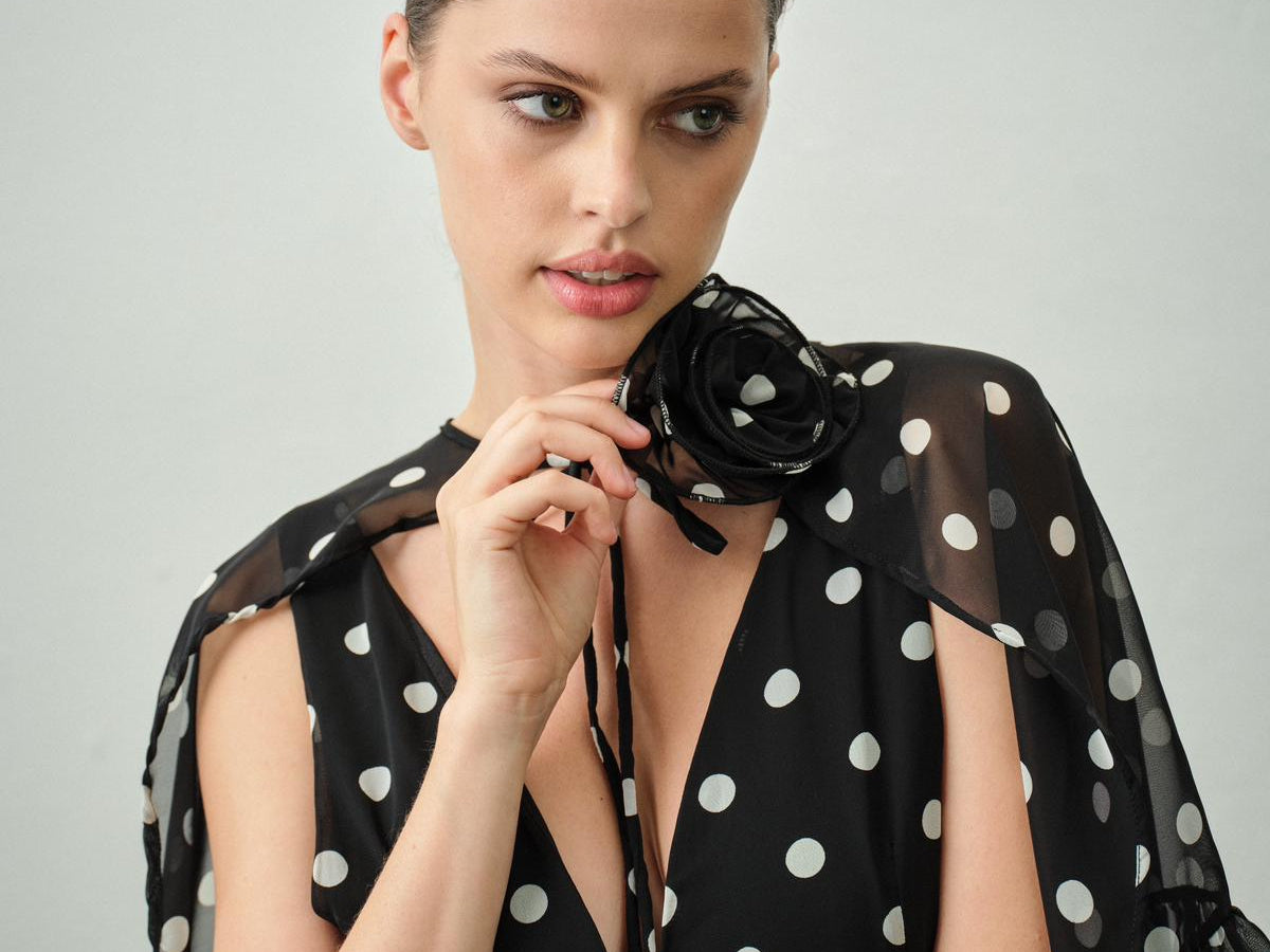 Polka dot sheer mini dress designed with a flattering V-neckline. The look is elevated with a rose detail placed on the cape-like collar.