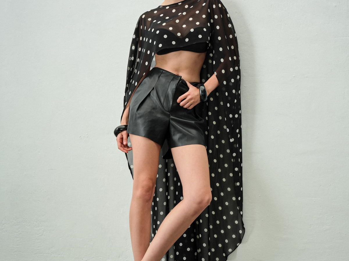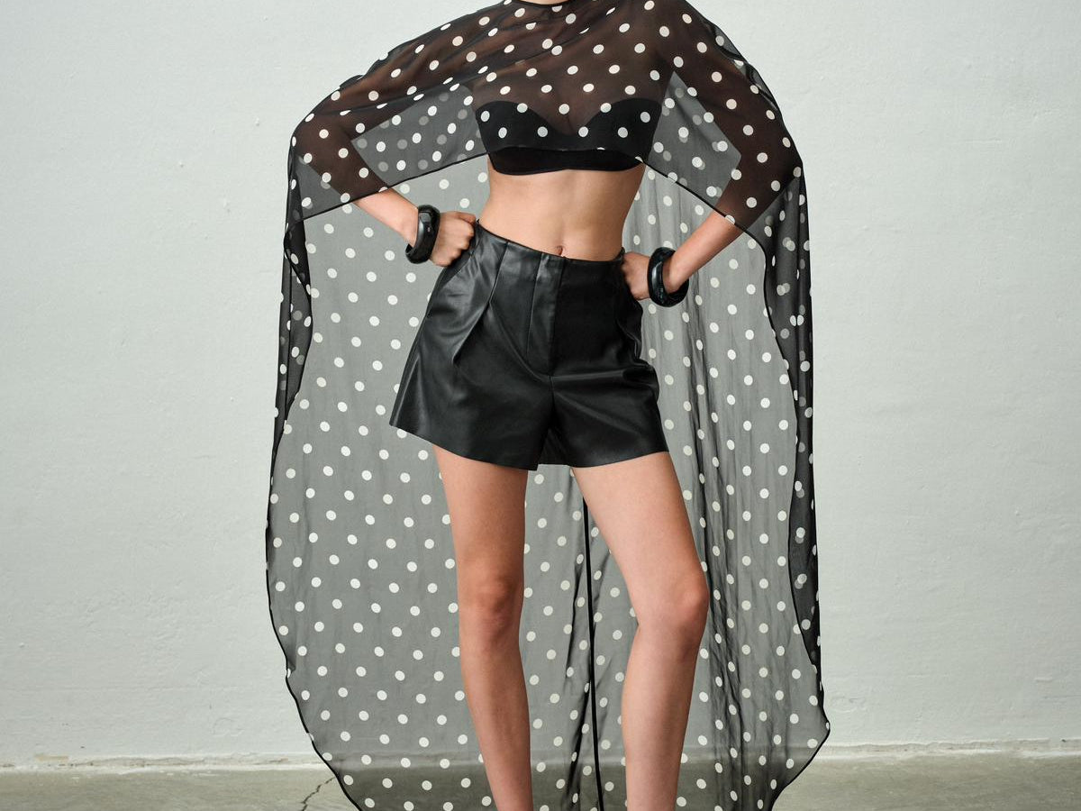 This blouse features a modern and bold silhouette, highlighted by its sheer black fabric adorned with white polka dots. The asymmetrical cape-style extension flows gracefully with every step, while the cropped cut creates a contemporary balance. Designed with an inner bustier effect, it can be styled as a complete look. Perfect for elegant events or daring city outfits, it’s an ideal choice for those who want to stand out with confidence.